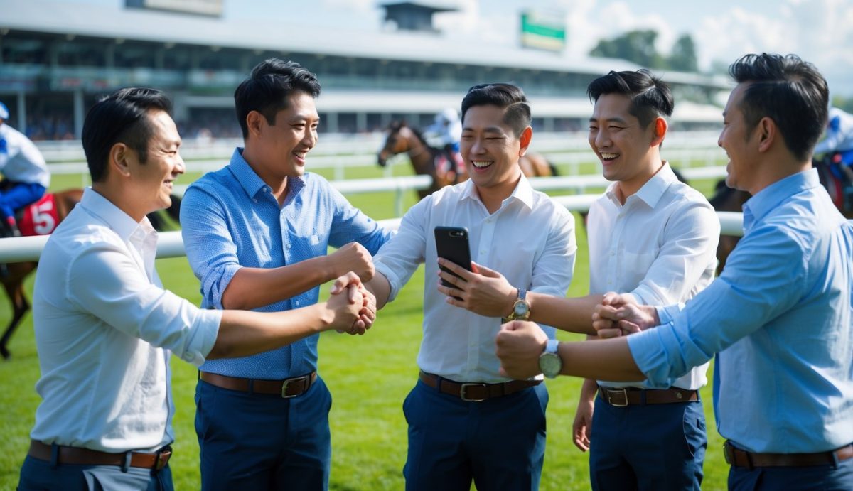 Sekelompok pria merayakan kemenangan taruhan balap kuda di sebuah arena balap dengan latar belakang kuda dan joki.