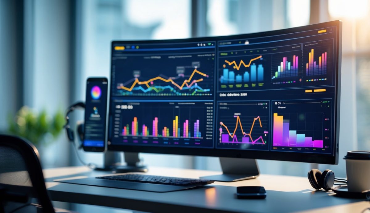 Sebuah ruang kerja modern dengan komputer menampilkan grafik data waktu nyata tentang RTP situs game online.