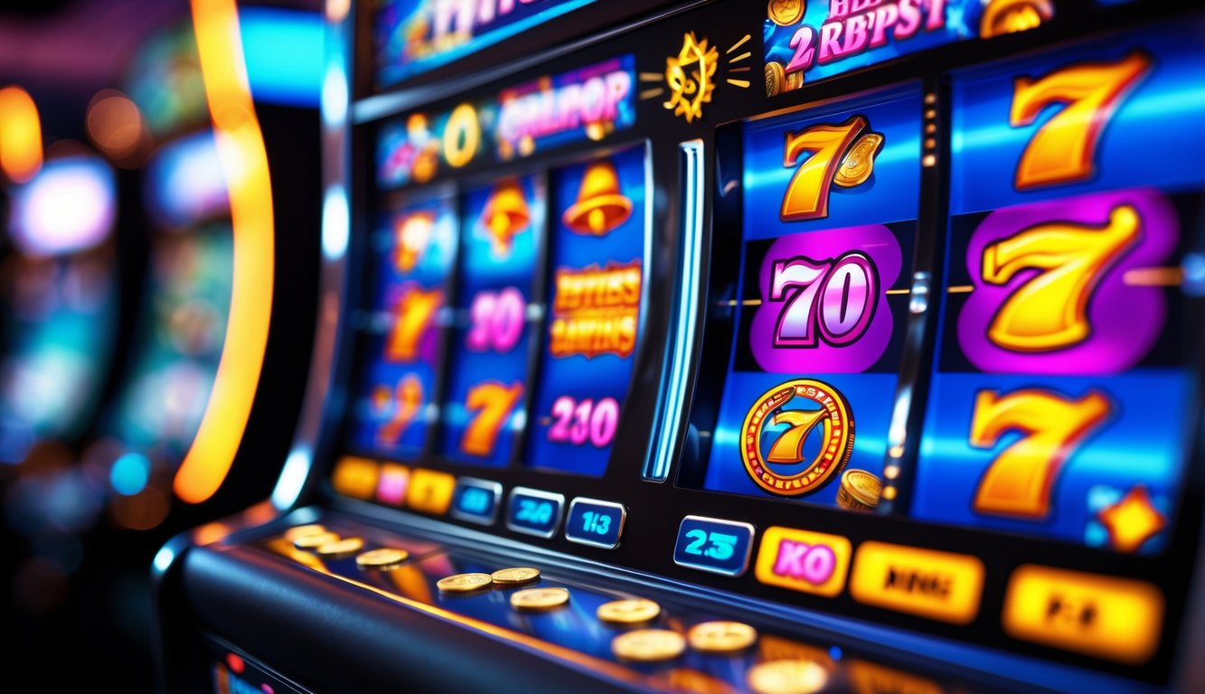 Mesin slot modern dengan layar digital berwarna cerah menampilkan simbol kemenangan dan suasana kasino yang hidup.