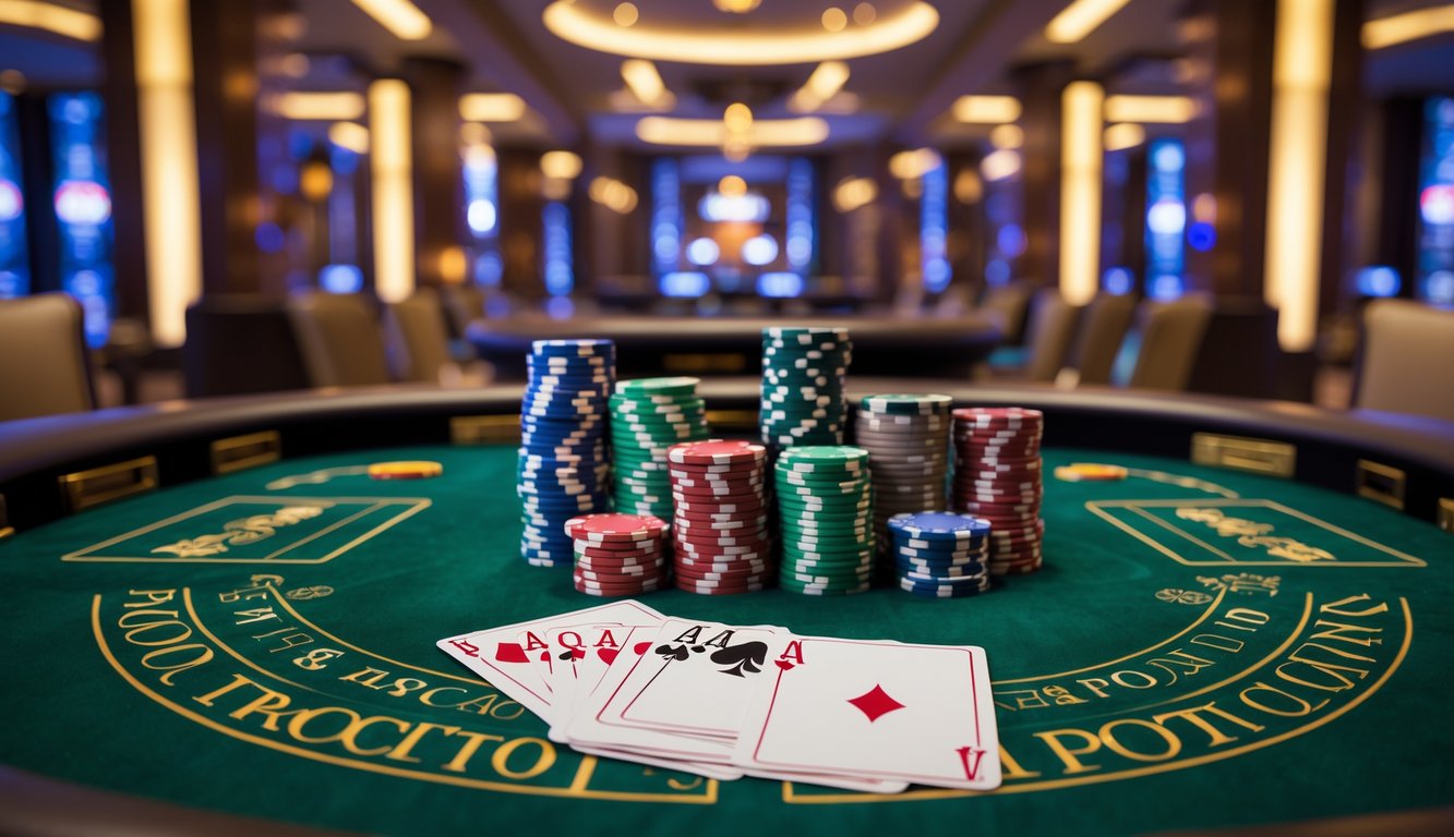 Meja baccarat mewah di kasino dengan kartu dan tumpukan chip poker berwarna-warni, latar belakang interior kasino yang elegan dan pencahayaan hangat.