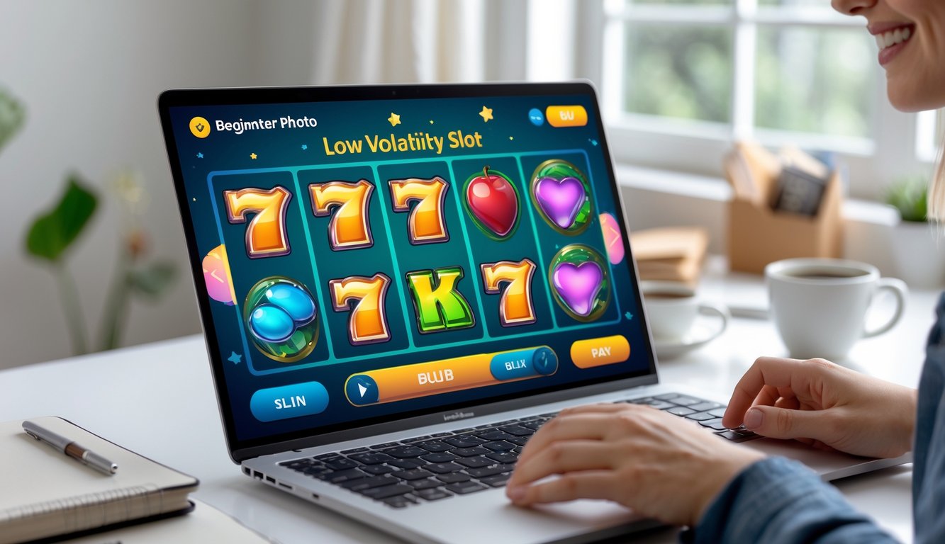 Seorang pemula bermain permainan slot online di laptop dengan suasana ruang kerja yang nyaman dan perlengkapan belajar di sekitar.